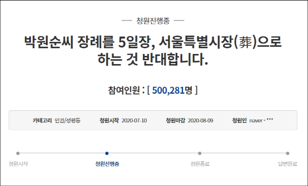 박원순 시장의 장례를 서울특별시장으로 하는 것을 반대하는 청원이 50만이 넘어섰다.